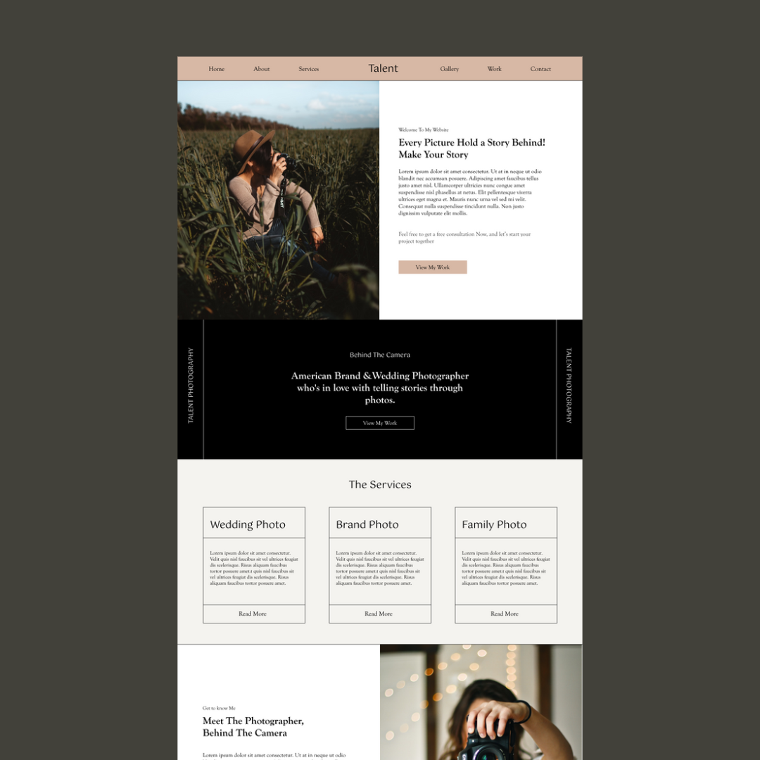 “Talent” is a stunning web design concept created for photography services. The sleek and modern layout, combined with a bold and unique color palette, makes this design stand out from the crowd. The elegant aesthetic is perfect for showcasing the beauty and creativity of photography, making it an ideal platform for both professional photographers and amateurs.